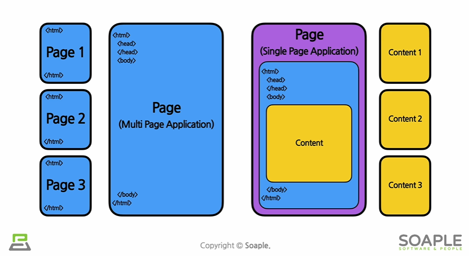 Single Page Application의 약자로 아래의 그림으로 이해해볼수있다