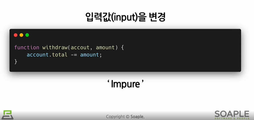 위의 예제에서 impure 함수는 account의 total 속성을 amount만큼 가감해줌으로써 변경해주었다. 따라서 impure함수라고 할수있다.