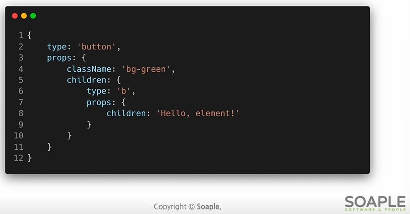 react에서는 이렇게 정의해준 element들의 정보를 받고, 이를 react 전용트리인 virtual dom에 넣어준다.