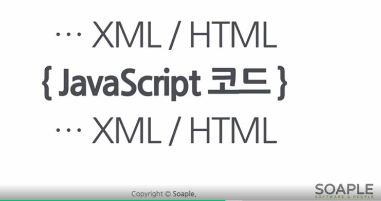 1. html/xml 코드사이에 중괄호를 사용해서 js 코드를 작성한다.